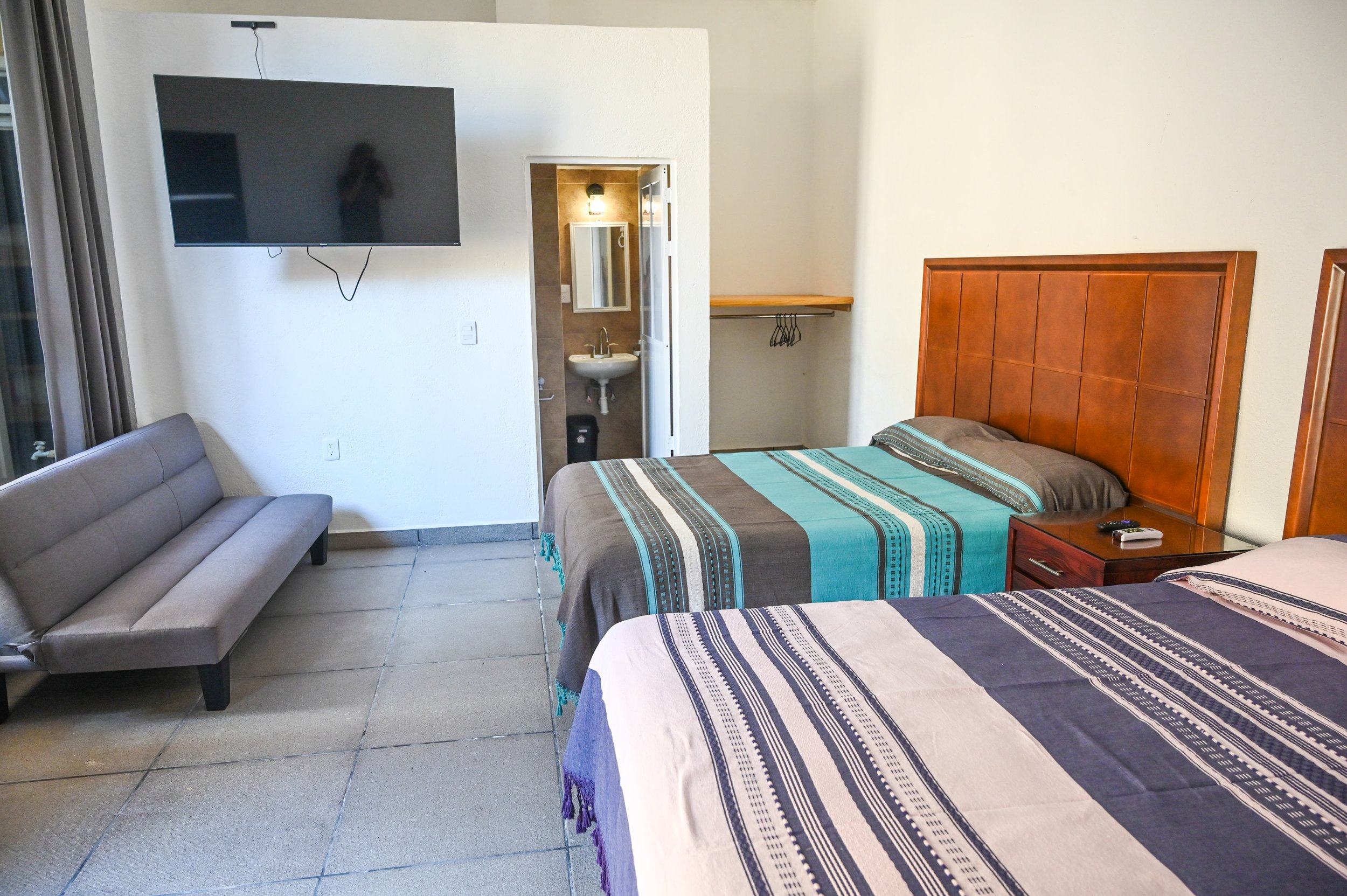 El alojamiento ofrece diversas opciones: habitaciones triples (Económica y Confort) con literas; suites Deluxe con camas King Size o dobles; y estancias con cocineta y terraza. Destaca un departamento familiar para hasta 8 personas. Todas las unidades incluyen pantalla Smart, mobiliario funcional y, según la categoría, ventilador o áreas privadas.